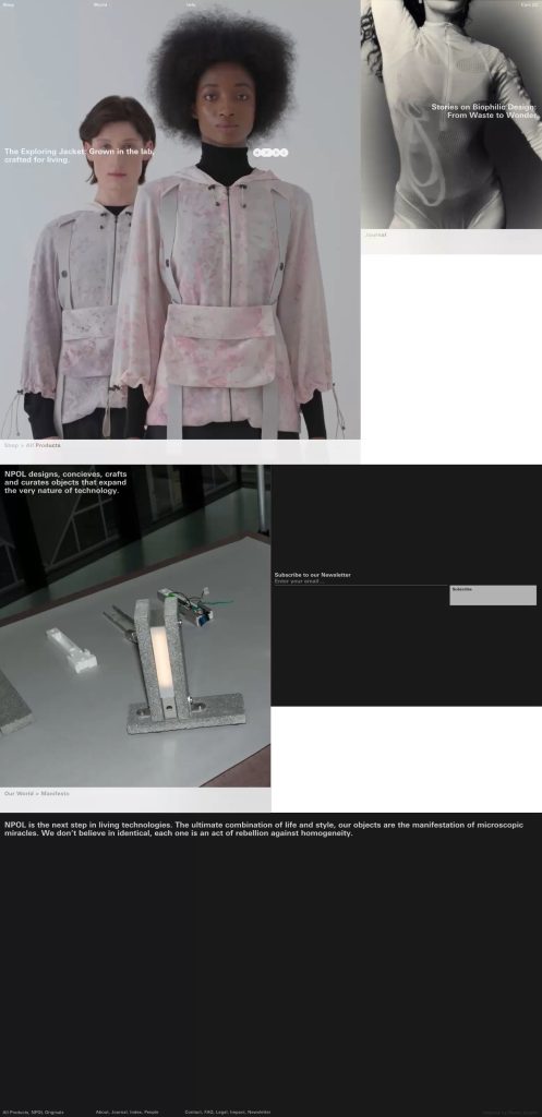 A digital place to nurture a new material culture for a planet-first lifestyle. This is where the living world shapes design, expressing its beauty in functional forms. The 'Normal Phenomena of Life' brand and online e-commerce platform are designed from scratch to present the curation of bio-based products in the most compelling way. The design of the shop is functional, minimalistic and surprisingly refined.