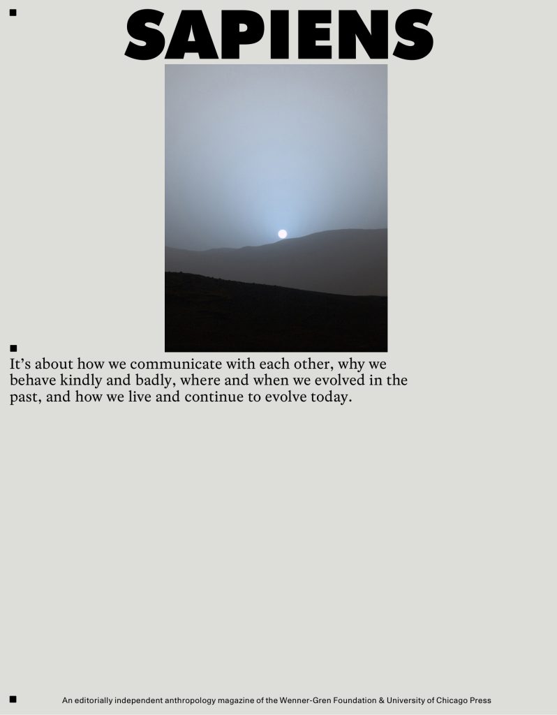 SAPIENS is a digital magazine, with over 2 million yearly readers, about the human world. It's about how we communicate with one another, where and when we evolved in the past, and how we live and continue to evolve today. It's about the relationship between our laws and ethics, the cities we build, and the environment we depend on. It's about why sex, sports, and violence consume and intrigue us, what life was like in centuries past, where we might be headed in centuries to come, and much more.