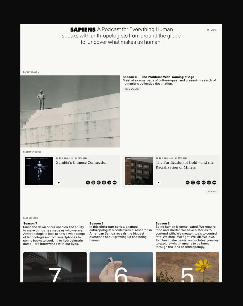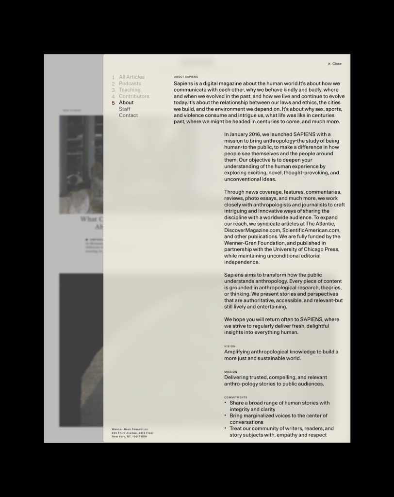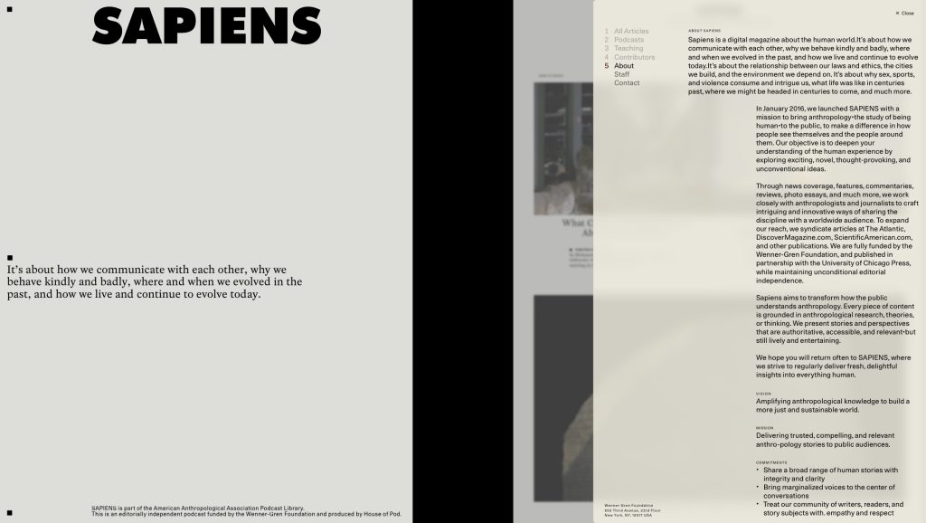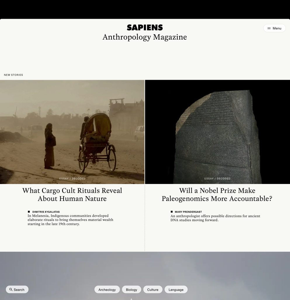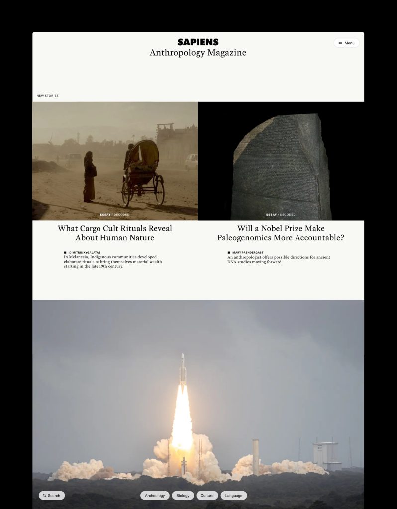 Sapiens Magazine site was conceived as a dynamic editorial platform that engages broad public audiences through storytelling. Content emphasises compelling narrative, human interest, and accessibility, with design cues drawn from both print editorial tradition and modern digital reading experiences. The identity positions Sapiens as a credible, thoughtful, and globally relevant magazine about humanity, while remaining visually and tonally distinct from the more formal Foundation presence.