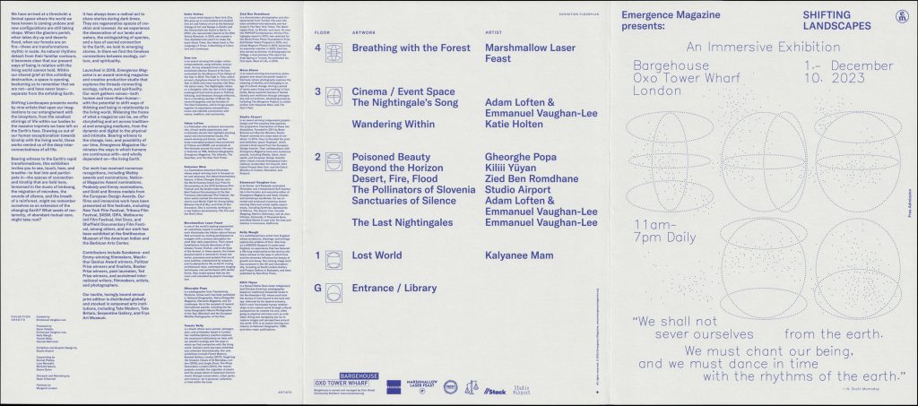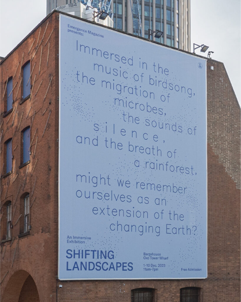 In December 2023, Emergence Magazine invited the public to step into SHIFTING LANDSCAPES: a unique immersive, multi-sensory ode to our changing Earth, open for a limited 10-day run at Bargehouse, an industrial exhibition space with 5 levels in the heart of London's South Bank.
