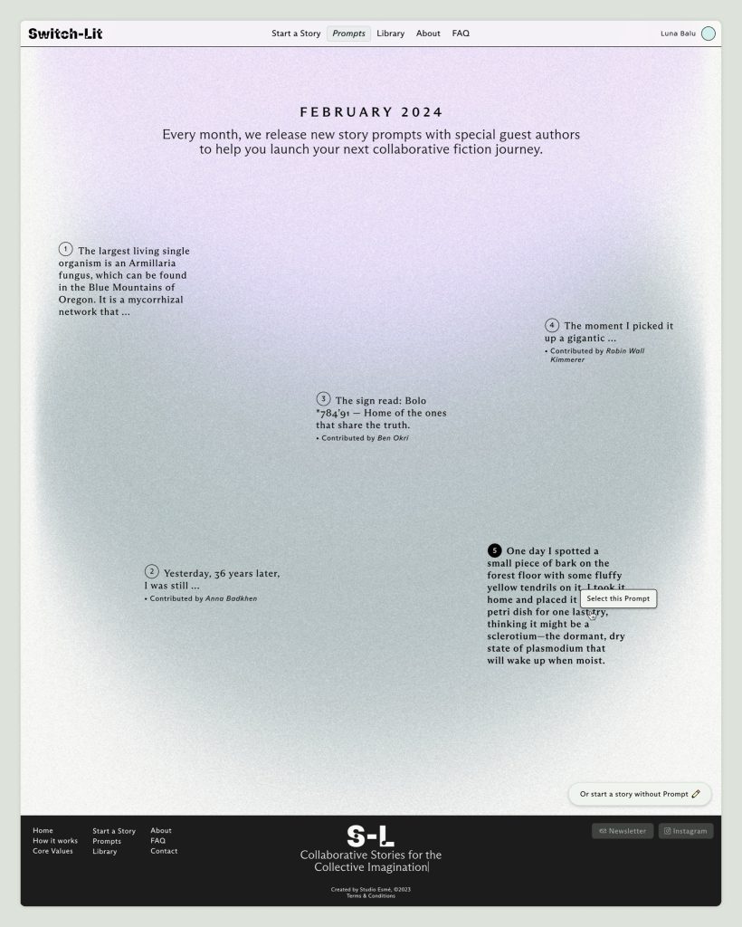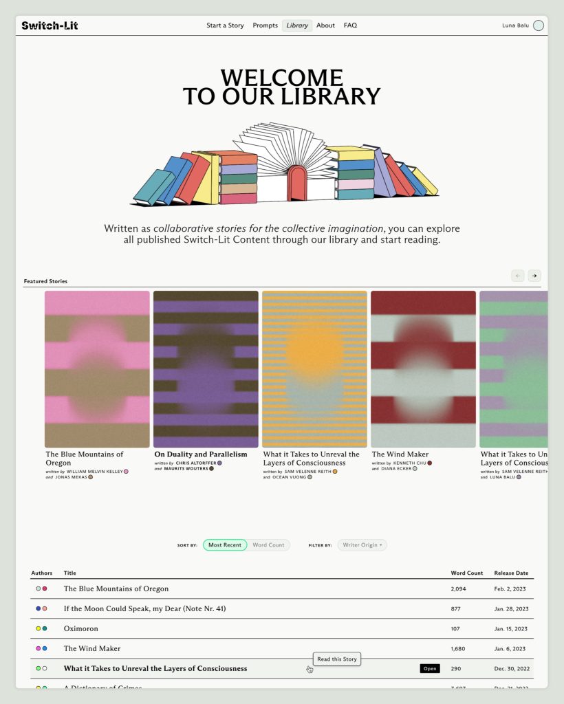 Switch-Lit is a digital platform with a universal mission: to manifest the collective imagination of creative writers and literary artists through the connective power of collaborative fiction, poetry, and prose. Switch-Lit is a creative playground in a remote forest of the Internet where the forces of your imagination can freely meet and connect with other writers towards the creation of new worlds, unimaginable by a single mind.