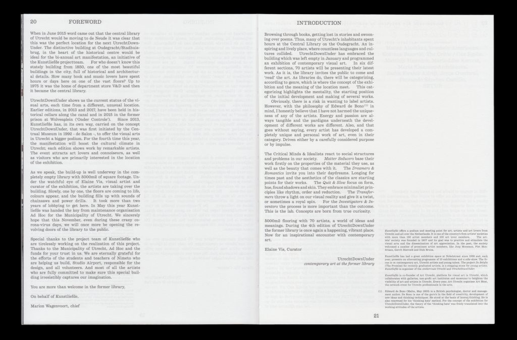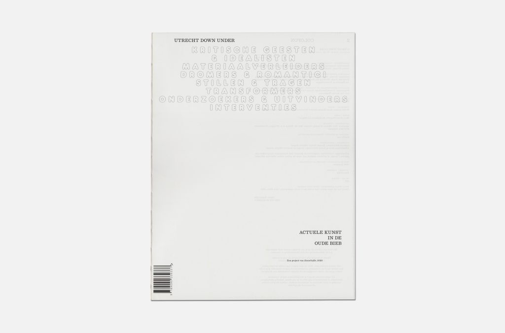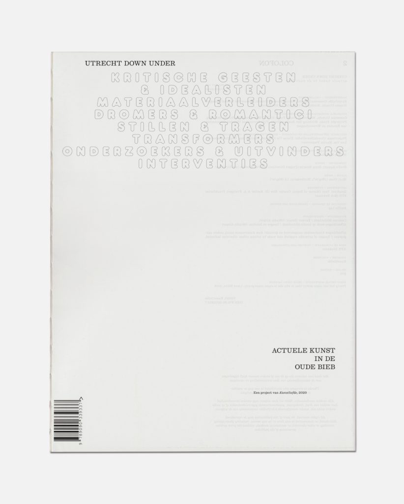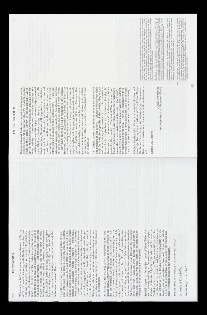 Utrecht Down Under presents contemporary art on exceptional locations. The 2020 edition was held in the former Central Library of Utrecht. Both the exhibition and visual communication was based on fictive sections of the library: Transformers, Matter Seducers, Investigators and Inventors. The design aims to embrace both the history of the place as well as the contemporary art of the exhibitors.