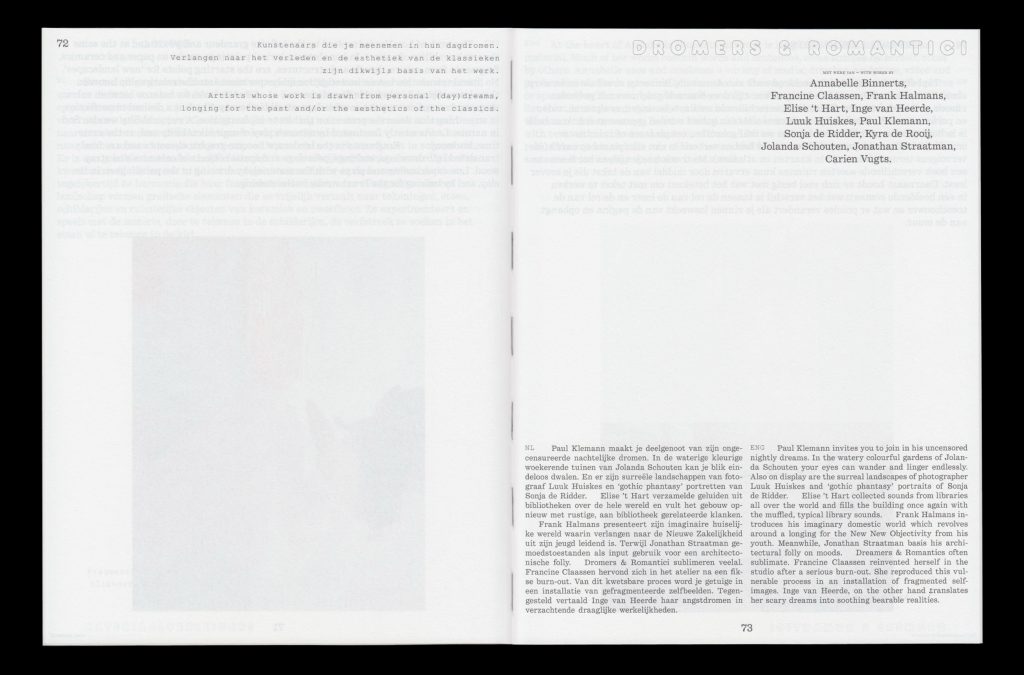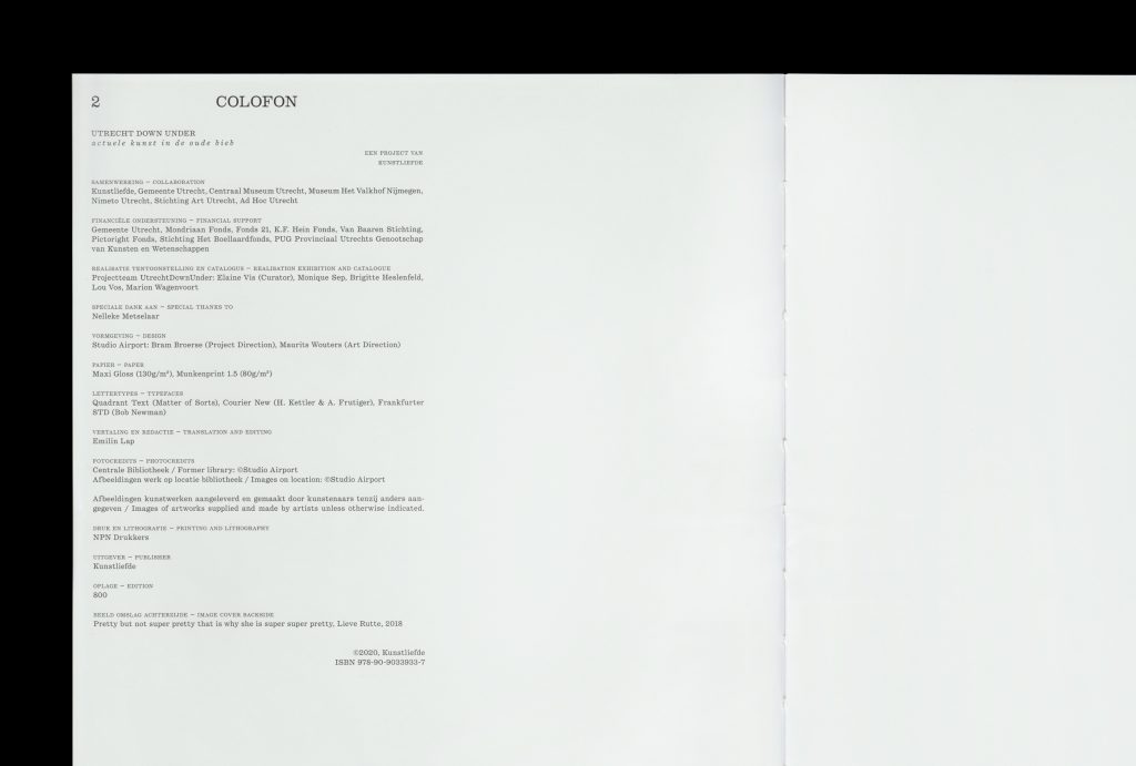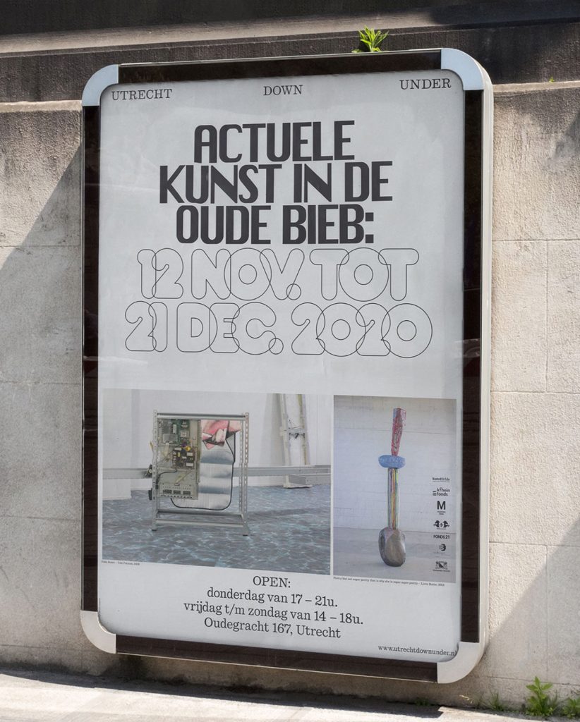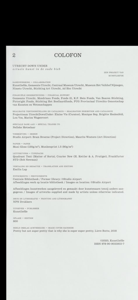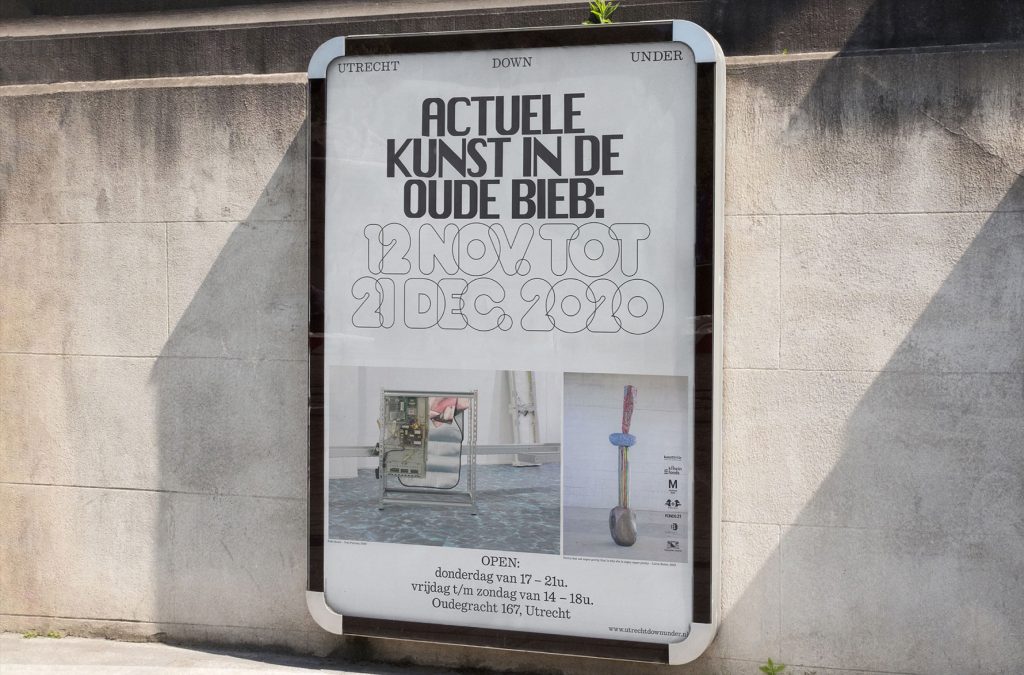 Utrecht Down Under presents contemporary art on exceptional locations. The 2020 edition was held in the former Central Library of Utrecht. Both the exhibition and visual communication was based on fictive sections of the library: Transformers, Matter Seducers, Investigators and Inventors. The design aims to embrace both the history of the place as well as the contemporary art of the exhibitors.